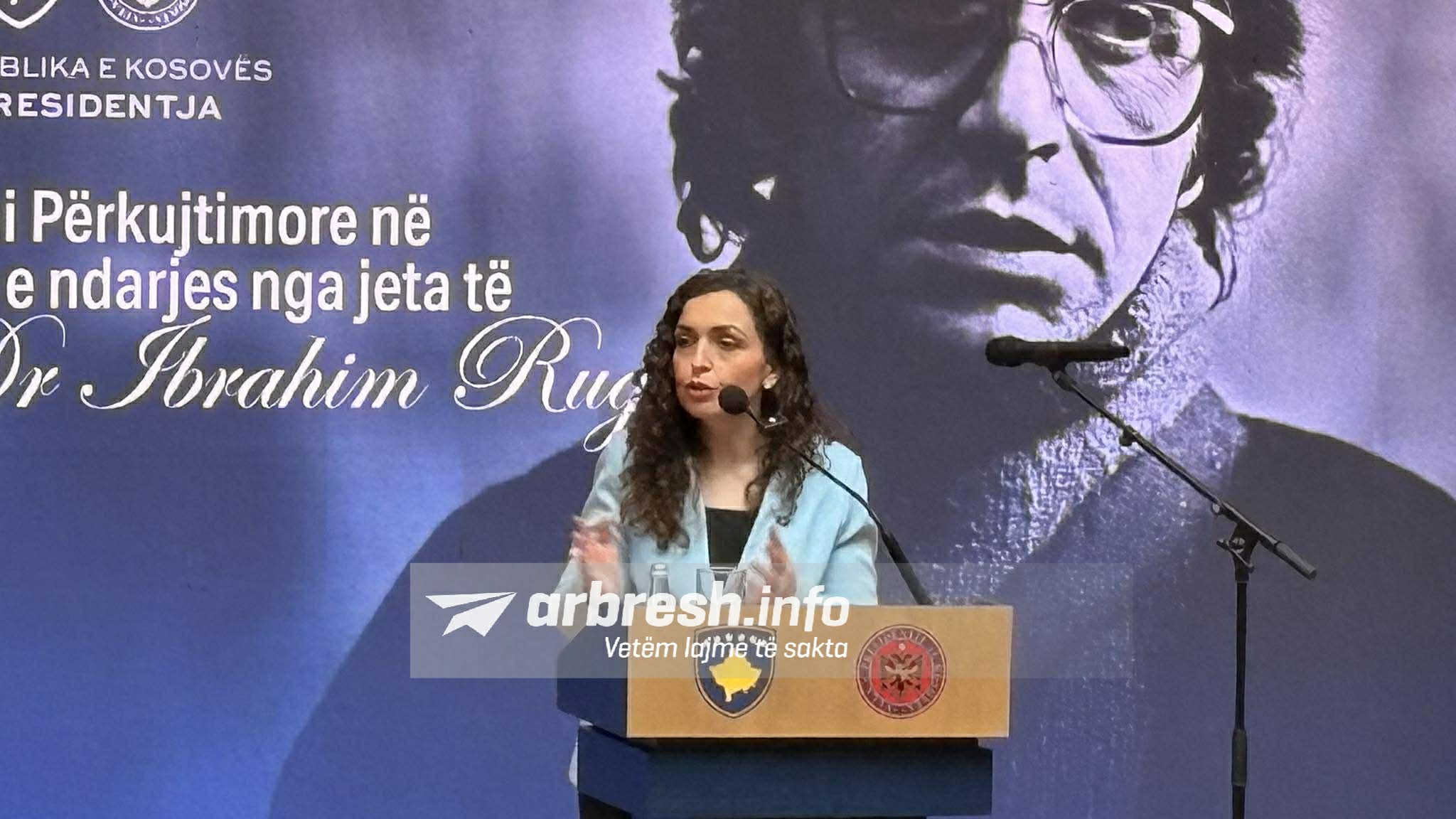 “Askush nuk e mishëroi shprehjen “unë, biri yt Kosovë” më fuqishëm se Presidenti Ibrahim Rugova. Ai ishte biri i saj në bindje, në përkushtim dhe në sakrificë – i lidhur ngushtë me tokën e vet, me popullin dhe me vlerat e tij. I butë në sjellje, por i palëkundur në qëndrim, ai i dha Kosovës gjithçka që kishte”, u shpreh ajo.