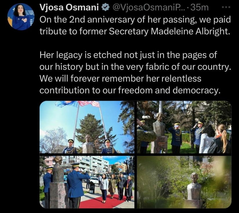 Presidentja e Kosovës, Vjosa Osmani, ka bërë homazhe pran bustit të ish-Sekretares amerikane të Shtetit, Madeleine Albright, në dy vjetorin e vdekjes së saj.