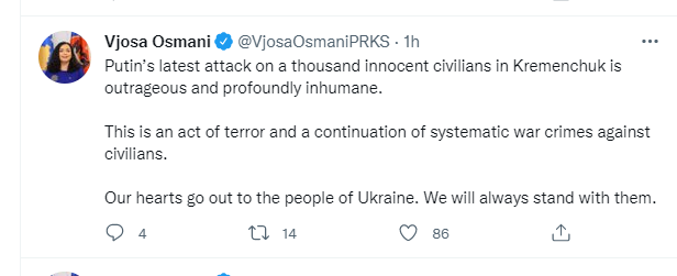“Ky është një akt terrori dhe një vazhdimësi e krimeve sistematike të luftës kundër civilëve. Zemrat tona janë për popullin e Ukrainës. Ne do të qëndrojmë gjithmonë me ta”, ka shkruar Osmani.