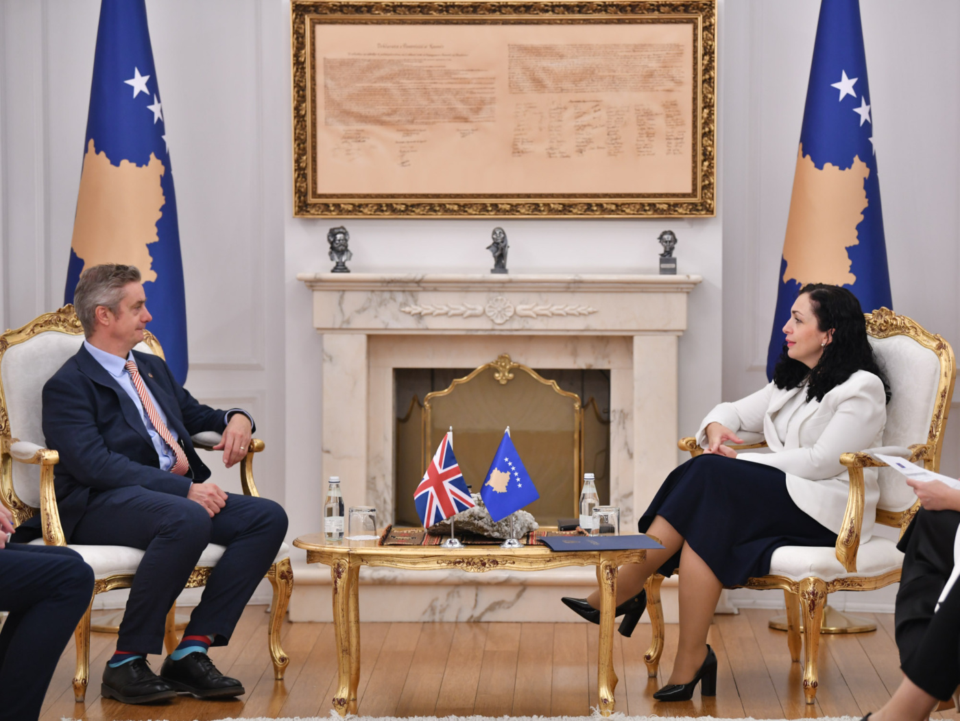 Presidentja e Republikës së Kosovës, Vjosa Osmani, ka pritur sot në takim ambasadorin e Mbretërisë së Bashkuar në Kosovë, Jonathan Hargreaves, me të cilin ka diskutuar për përgatitjet për Samitin e Komunitetit Politik Evropian, si dhe për bashkëpunimin bilateral midis Kosovës dhe Mbretërisë së Bashkuar.