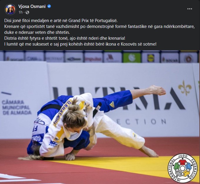 Presidentja e vendit, Vjosa Osmani, u shpreh e lumtur me suksesin e radhës të xhudistes Distria Krasniqi, që u shpall e artë në Grand Prix të Portugalisë.