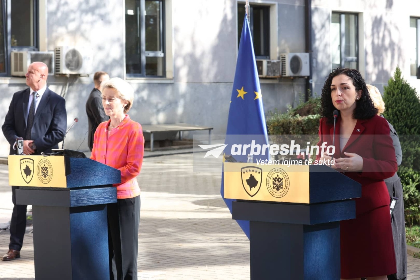 Presidentja e Kosovës, Vjosa Osmani dhe Presidentja e Komisionit Evropian, Ursula von der Leyen, pas takimit një orësh, kanë mbajtur një konferencë të përbashkët për medie.
