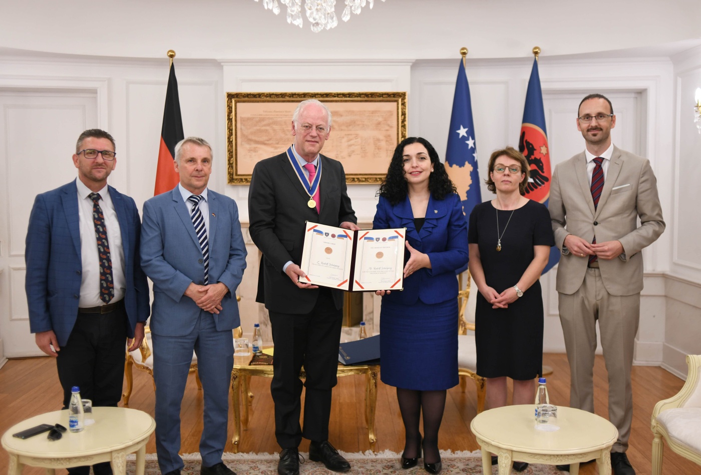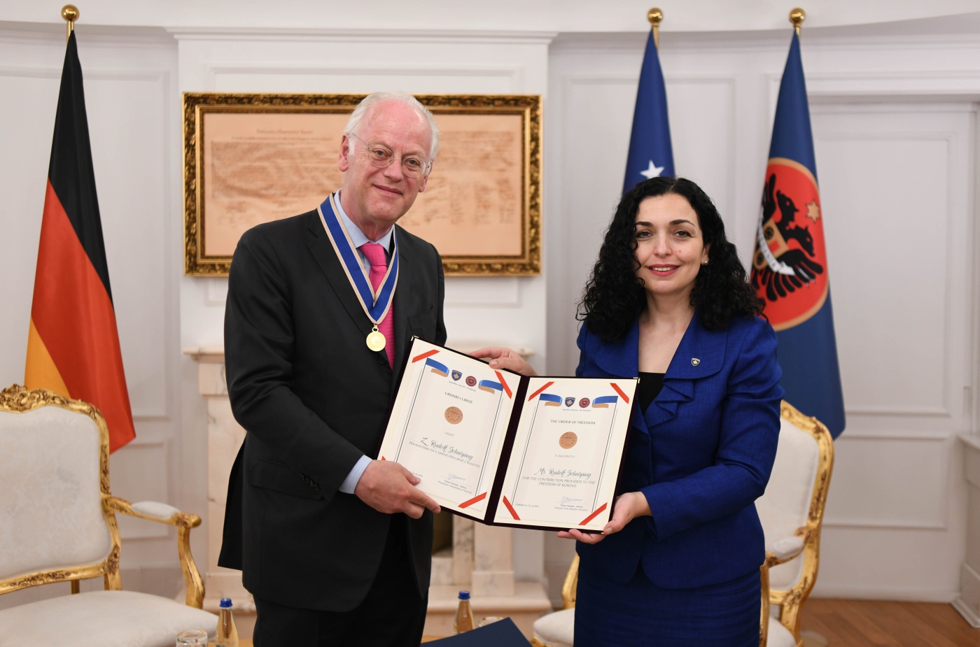 Presidentja e Republikës së Kosovës, Vjosa Osmani në një ceremoni të mbajtur në Presidencë, me motivacionin për kontribut për lirinë e Kosovës ia ka dorëzuar Medaljen Urdhri i Lirisë, ish-ministrit të Mbrojtjes së Gjermanisë, Rudolf Scharping.