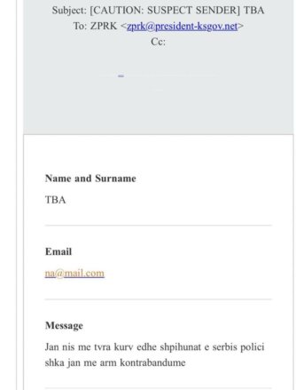 “Jan nis me t’vra k***, edhe shpihunat e serbis polici shka jan me arm kontrabandume”, thuhet në emaili-n kërcënuaes.