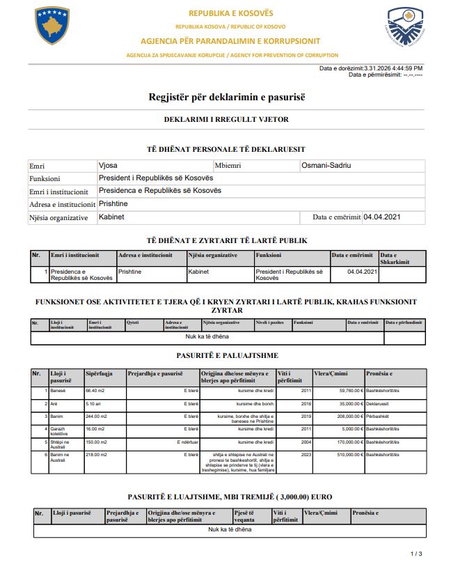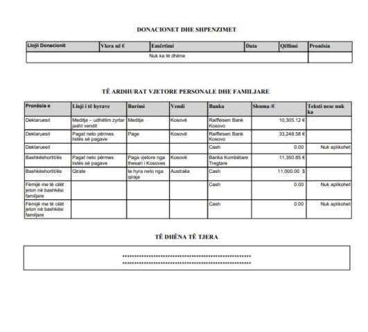 Tek të hyrat vjetore të bashkëshortit, Osmani ka renditur 11 mijë e 350 euro nga paga dhe 11 mijë dollarë nga qiraja në Australi.