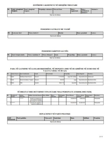 Tek pasuritë e paluajtshme, nuk ka ndonjë ndryshim. Në pronësi të saj ka deklaruar një arë në vlerë 35 mijë euro, ndërsa në pronësi të përbashkët një shtëpi në vlerë 208 mijë euro.