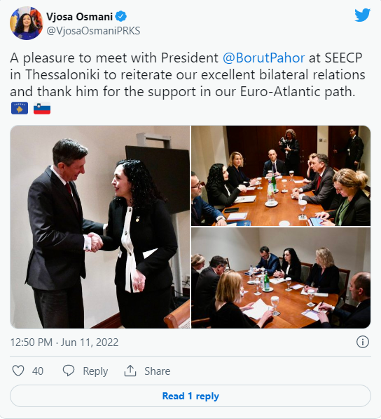 “Kënaqësi ta takoja presidentin Borut Pahor në SEECP në Thessaloniki për të ritheksuar marrëdhëniet tona të shkëlqyera dypalëshe dhe për ta falënderuar për mbështetjen në rrugën tonë euroatlantike”, ka shkruar Osmani.