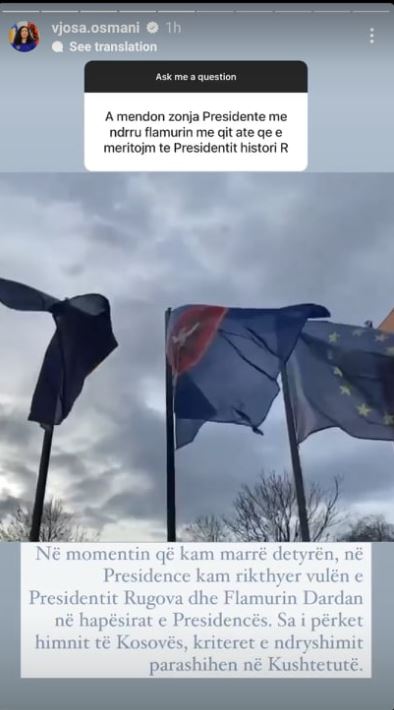 “Në momentin që e kam marrë detyrën, në Presidencë e kam rikthyer vulën e Presidentit Ibrahim Rugova dhe flamurin dardan në hapësirat e Presidencës”.