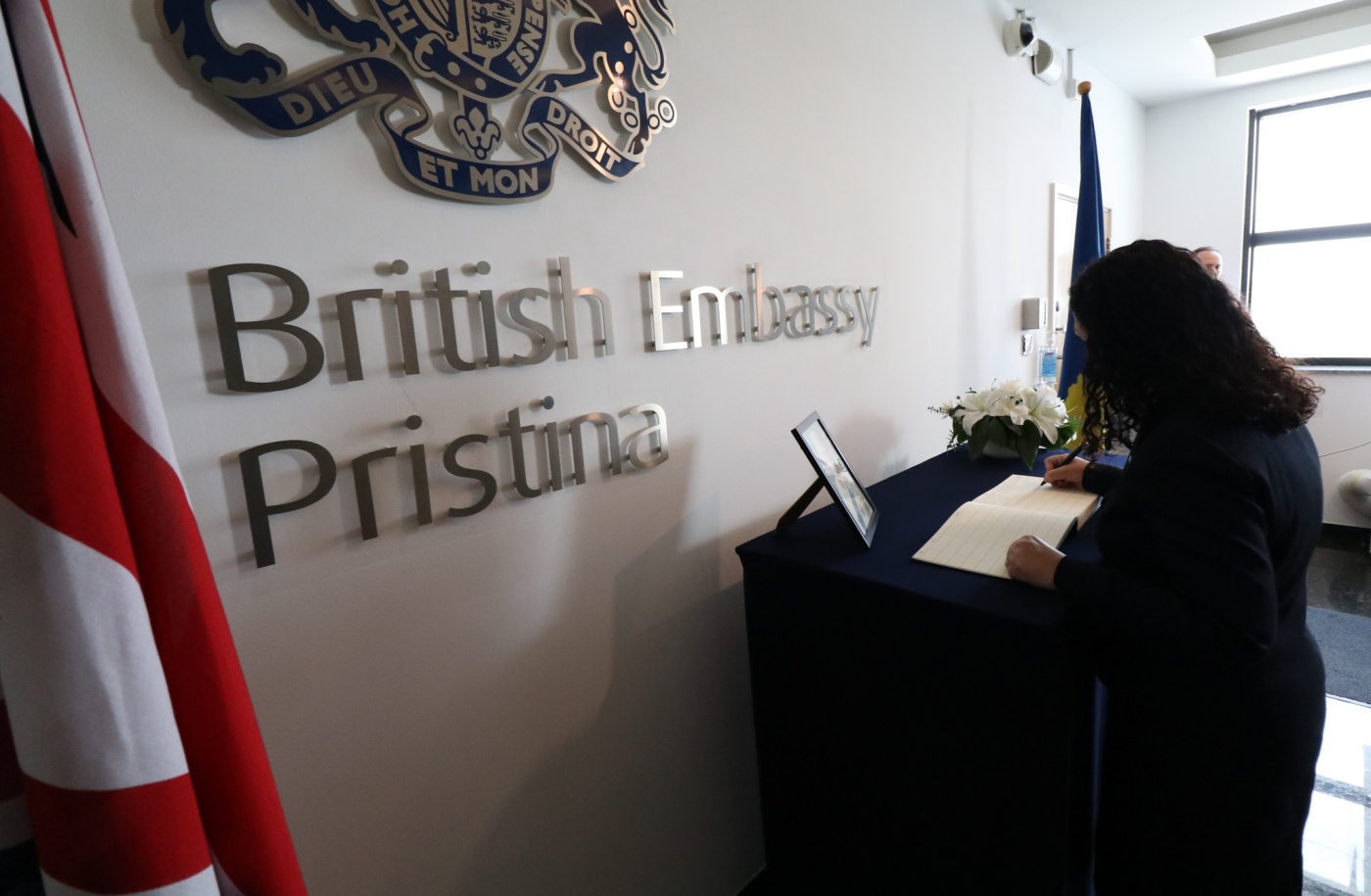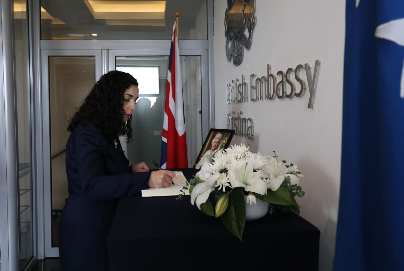 Presidentja e Kosovës, Vjosa Osmani është parë sot në Ambasadën e Britanisë së Madhe, ku ka nënshkruar librin e ngushëllimeve për Mbretëreshën Elizabeta e Dytë, e cila ndërroi jetë ditë më parë.