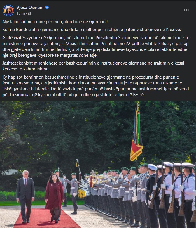 “Gjatë vizitës zyrtare në Gjermani, në takimet me Presidentin Steinmeier, si dhe në takimet me ish- ministrin e punëve të jashtme, z. Maas fillimisht në Prishtinë me 22 prill të vitit të kaluar, e pastaj dhe gjatë qëndrimit tim në Berlin, kjo ishte një prej diskutimeve kryesore, e cila reflektonte edhe një prej brengave kryesore të mërgatës sonë atje. Jashtëzakonisht mirënjohëse për bashkëpunimin e institucioneve gjermane në trajtimin e kësaj kërkese të kahmotshme”, ka shkruar Osmani.
