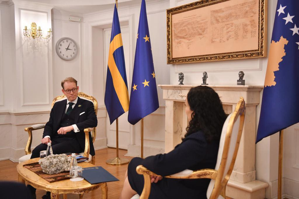 Presidentja e Republikës së Kosovës, Vjosa Osmani, ka pritur sot në takim ministrin për Punë të Jashtme të Suedisë, Tobias Billström, të cilin e ka falënderuar për mbështetjen e shtetit suedez ndaj Kosovës që nga vitet e 90-ta, në procesin e shtetformimit, shtetëndërtimit dhe anëtarësimit në organizata ndërkombëtare.