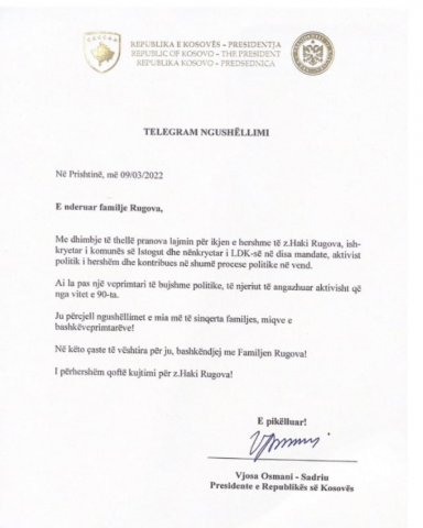 “Ai la pas një veprimtari të bujshme politike, të njeriut të angazhuar aktivisht që nga vitet e 90-ta. Ju përcjell ngushëllimet e mia më të sinqerta familjes, miqve e bashkëveprimtarëve! Në këto çaste të vështira për ju, bashkëndjej me Familjen Rugova! I përhershëm qoftë kujtimi për z.Haki Rugova!”, përfundon telegram i Presidentes Osmani./arbresh.info/