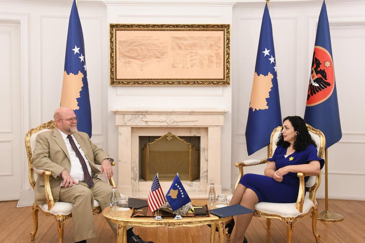 Presidentja e Republikës së Kosovës, Vjosa Osmani, ka pritur sot në takim ambasadorin amerikan në Kosovë, Jeff Hovenier.