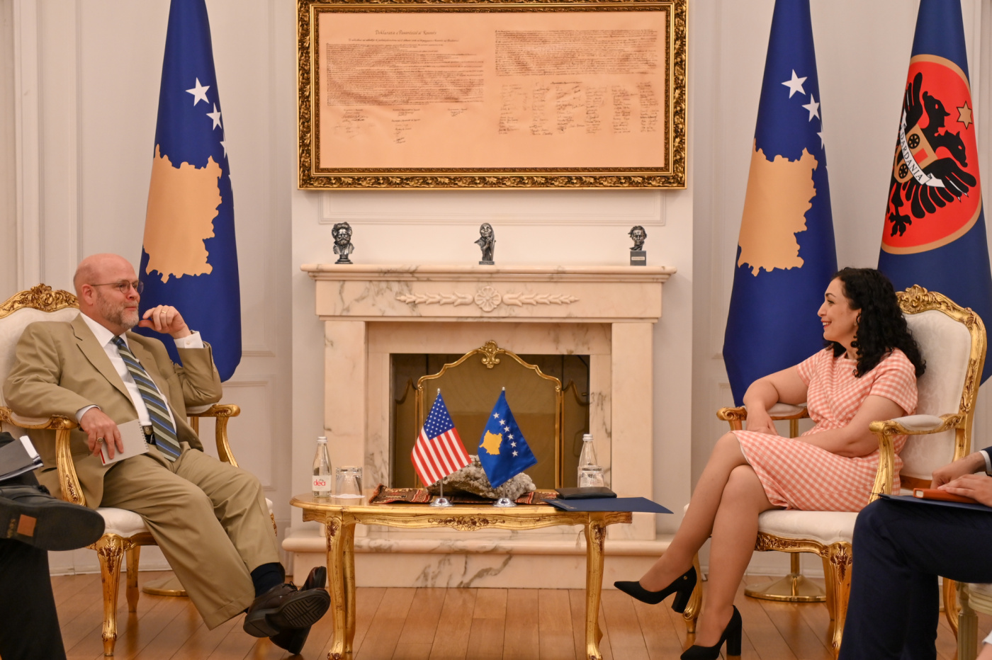Presidentja e vendit, Vjosa Osmani ka pritur sot në takim ambasadorin e Shteteve të Bashkuara, Jeffrey Hovenier, me të cilin bisedoi për zhvillimet në vend, me fokus të veçantë në procesin e dialogut ndërmjet Kosovës dhe Serbisë.