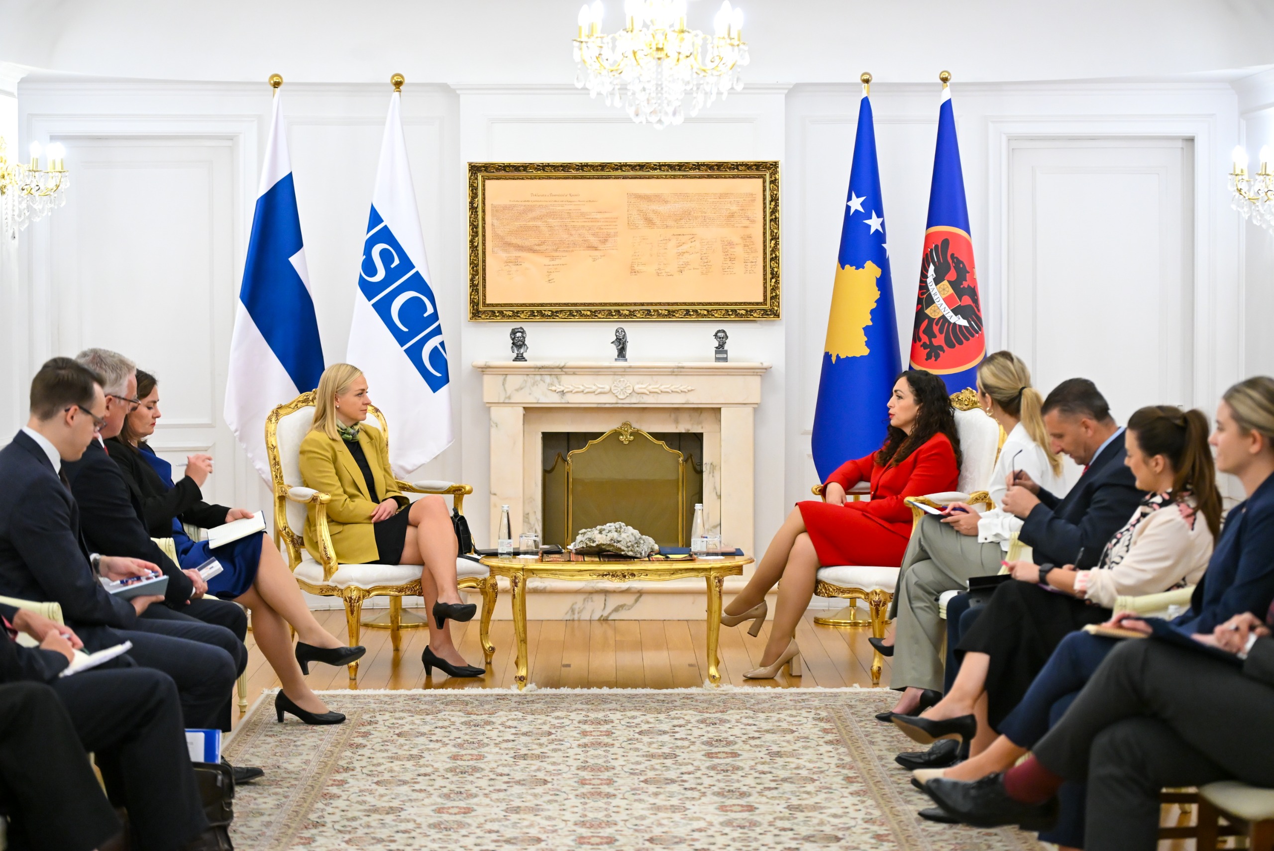 Në cilësinë e Kryesueses së OSBE-së, znj. Valtonen u informua nga Presidentja Osmani mbi zhvillimet e fundit në Kosovë, përkushtimin e institucioneve ndaj paqes dhe stabilitetit si dhe zbatimin e rendit dhe ligjit.