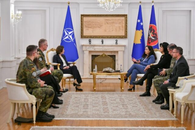Presidentja e Kosovës, Vjosa Osmani, priti sot në takim Shefen e Operacioneve Aktuale në Selinë e NATO-s, Ariella Viehe, drejtorin në largim të NALT-it, Gjeneral Brigade Christian Nawrat dhe Drejtorin e ri, Gjeneral Brigade Dr. Sven Lange.