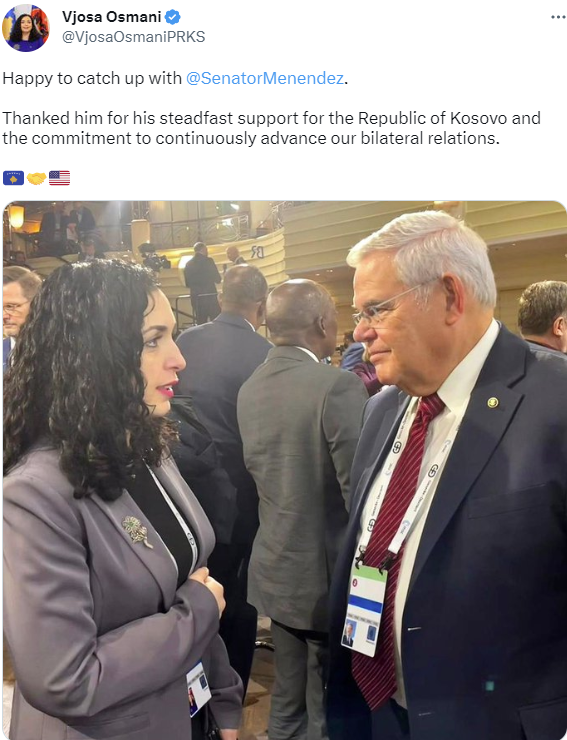“E lumtur të diskutoj me senatorin Menendez. E falënderova për mbështetjen e palëkundur për Republikën e Kosovës dhe përkushtimin për avancimin e vazhdueshëm të marrëdhënieve tona dypalëshe”, ka shkruar Osmani në Twitter. /arbresh.info/