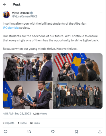 “Studentët tanë janë shtylla kurrizore e së ardhmes sonë. Ne do të vazhdojmë të sigurojmë që secili prej tyre të ketë mundësinë të shkëlqejë dhe të dhurojë. Sepse kur mendjet tona të reja lulëzojnë, Kosova lulëzon”, shkroi Osmani./Arbresh.info/