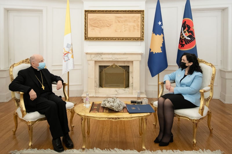 Presidentja e Republikës së Kosovës, Vjosa Osmani, e priti sot në takim nuncin apostolik të Selisë së Shenjtë në Lubjanë, njëherësh delegat apostolik për Kosovën, monsinjor Jean Marie Speich.