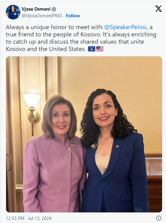 “Është gjithmonë kënaqësi të diskutosh për vlerat e përbashkëta që bashkojnë Kosovën dhe SHBA-në”, ka thënë Osmani./Arbresh.info/