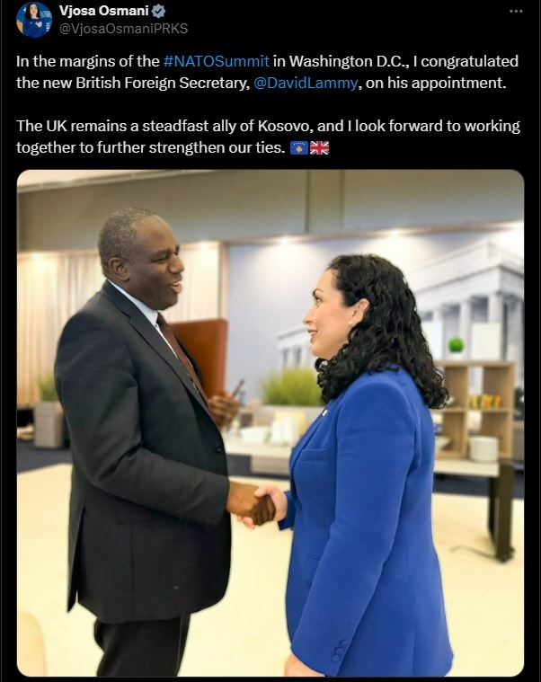 “Në margjinat e Samitit të NATO-s në Uashington D.C., urova Sekretarin e ri të Jashtëm britanik, David Lammy , për emërimin e tij. Mbretëria e Bashkuar mbetet një aleat i palëkundur i Kosovës dhe unë pres që të punojmë së bashku për të forcuar më tej lidhjet tona”, ka shkruar Osmani në X./Arbresh.info/