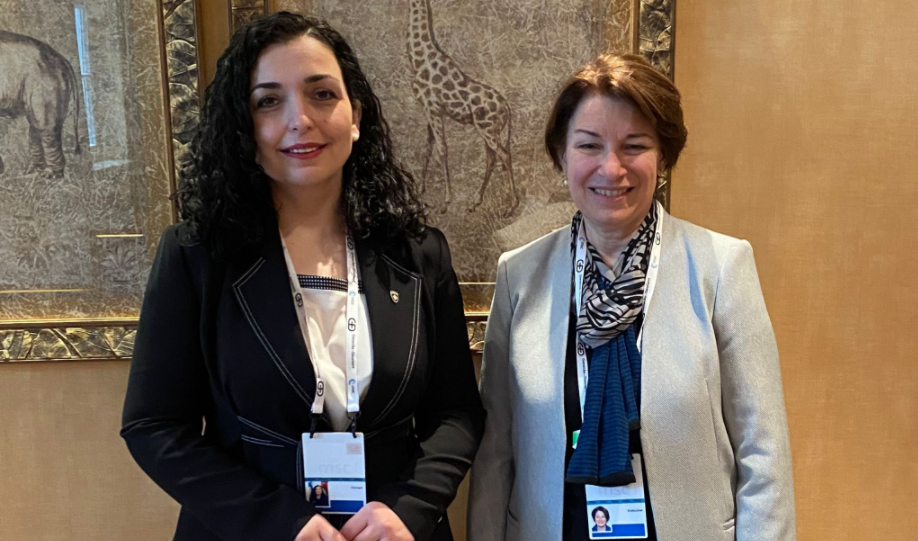 Presidentja e Kosovës, Vjosa Osmani, në Konferencën e Sigurisë së Mynihut, ka takuar senatoren amerikane nga Minnesota, Amy Klobuchar, me të cilën ka biseduar për relacionet Kosovë-SHBA.