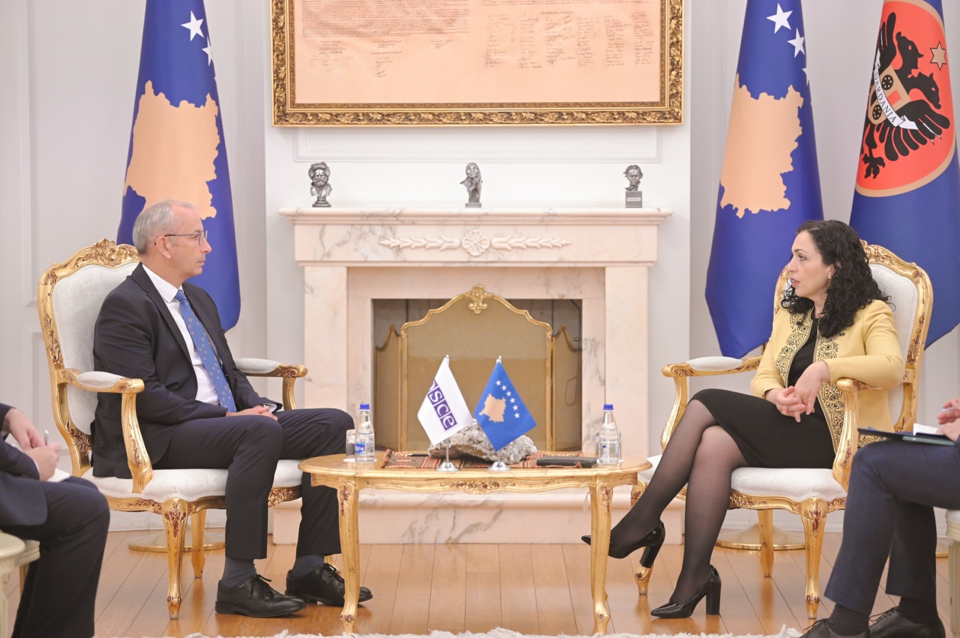 Presidentja e Republikës së Kosovës, Vjosa Osmani, priti sot në takim shefin e misionit të Organizatës për Siguri dhe Bashkëpunim në Evropë (OSBE) në Kosovë, ambasadorin Michael Davenport me të cilin foli për zhvillimet e fundit në veri të vendit.