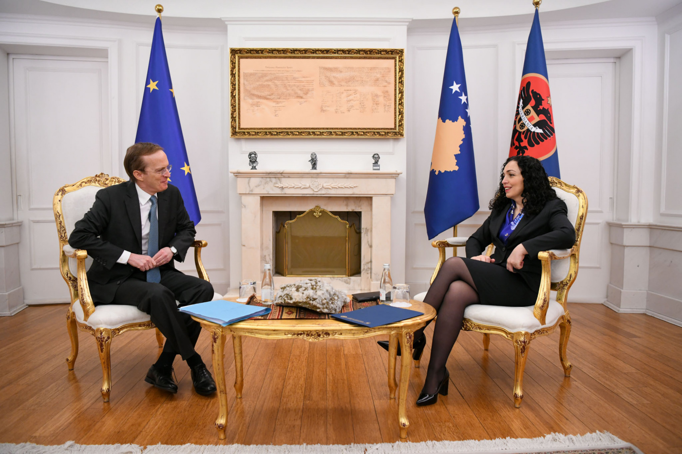 Presidentja e Republikës së Kosovës, Vjosa Osmani, ka pritur sot në takim Zëvendës Sekretarin e Përgjithshëm për Paqe, Siguri dhe Mbrojtje në Shërbimin Evropian të Veprimit të Jashtëm (EEAS), z. Charles Fries, i shoqëruar nga Shefi i Zyrës së BE-së në Kosovë, Tomas Szunyog dhe shefi i EULEX-it, Lars-Gunnar Wigemark.