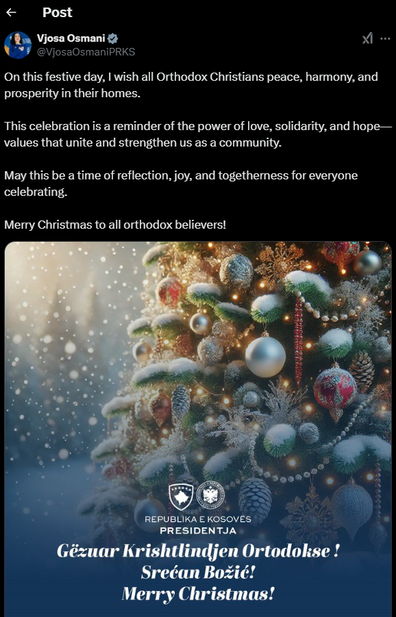 “Në këtë ditë festive, të gjithë të krishterëve ortodoksë u uroj paqe, harmoni dhe begati në shtëpitë e tyre. Kjo festë është një kujtesë e fuqisë së dashurisë, solidaritetit dhe shpresës—vlera që na bashkojnë dhe forcojnë ne si komunitet. Qoftë kjo një kohë reflektimi, gëzimi dhe bashkimi për të gjithë ata që festojnë. Gëzuar Krishtlindjet të gjithë besimtarëve ortodoksë!”, tha Osmani./Arbresh.info