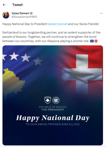 Përmes një postimi në Twitter e para e vendit ka thënë se Zvicra është partneri ynë i kahershëm dhe një përkrahës i flaktë i popullit të Kosovës”, ka shkruar Osmani.