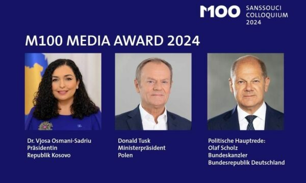 Presidentja e Republikës së Kosovës Vjosa Osmani është nderuar nga M100 Sanssouci Colloquium me Çmimin M100 Media Award për përkushtimin e saj ndaj vlerave euroatlantike dhe për “punën e saj të palodhur në reforma, forcimin e demokracisë, kursin proevropian, luftën kundër korrupsionit, si dhe për barazinë dhe të drejtat e grave”.