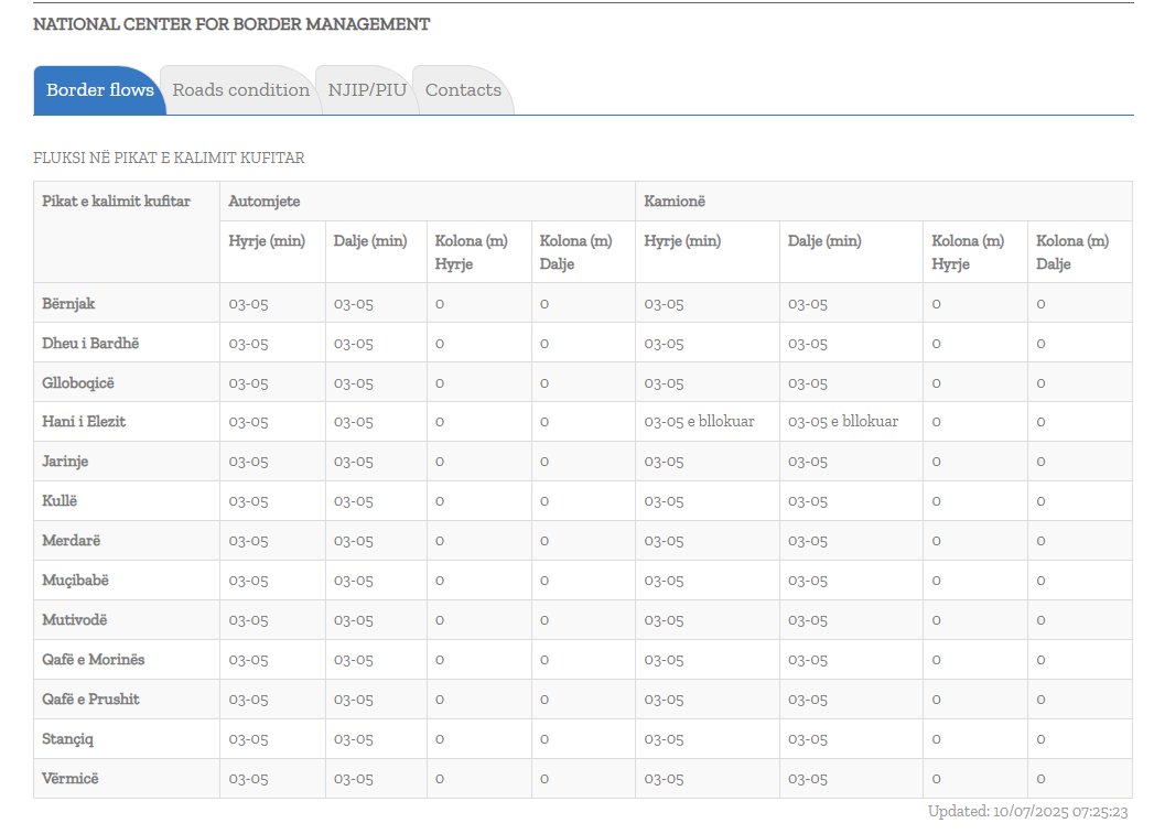 Sipas të dhënave të përditësuara nga Qendra Kombëtare për Menaxhim Kufitar në orën 07:25, automjetet dhe kamionët po kalojnë kufirin me kohë pritjeje prej vetëm 3 deri në 5 minuta, si në hyrje ashtu edhe në dalje.