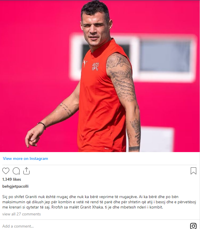 “Siç po shifet Graniti nuk është rrugaç dhe nuk ka bërë veprime të rrugaçëve. Ai ka bërë dhe po bën maksimumin që dikush jep për kombin e vetë në rend të parë dhe për shtetin që atij i besoj dhe e përvetësoj me krenari si qytetar të saj. Rrofsh sa malët Granit Xhaka, ti je dhe mbetesh nderi i kombit”, ka shkruar ai në llogarinë e tij zyrtare në Instagram.