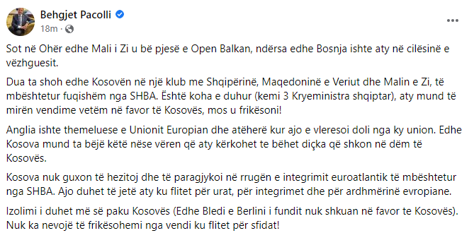 “Dua ta shoh edhe Kosovën në një klub me Shqipërinë, Maqedoninë e Veriut dhe Malin e Zi, të mbështetur fuqishëm nga SHBA. Është koha e duhur (kemi 3 Kryeministra shqiptar), aty mund të mirën vendime vetëm në favor të Kosovës, mos u frikësoni” ka thënë Pacolli përmes një postimi në rrjetin social Facebook.
