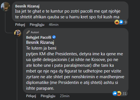 “Të lutem ja bëni pyetjen KM dhe Presidentes, detyra ime ka qene me ua sjellë delegacionin (ai ishte ne Kosovë, po në atë kohë unë i pata paralajmëruar) dhe tani ka mbet qe nje nga dy figurat te udhetojne per vizite zyrtare ne ate shtet per nenshkrimin e mardhenjeve diplomatike (me Prrsidentin e atij shteti) ashtu si ishte parapare”, shkroi ai.