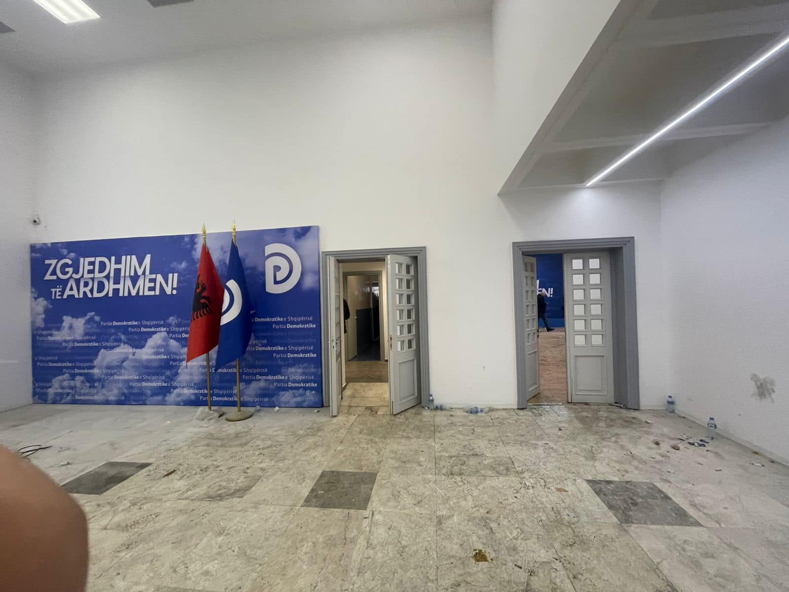 Më dyer, karrige e xhama të thyer, objekte të përmbysur kjo është pamja nga ambientet e brendshme të selisë së PD pasi protestuesit, mbështetës të ish kryeministrit Sali Berisha hynë në godinë.