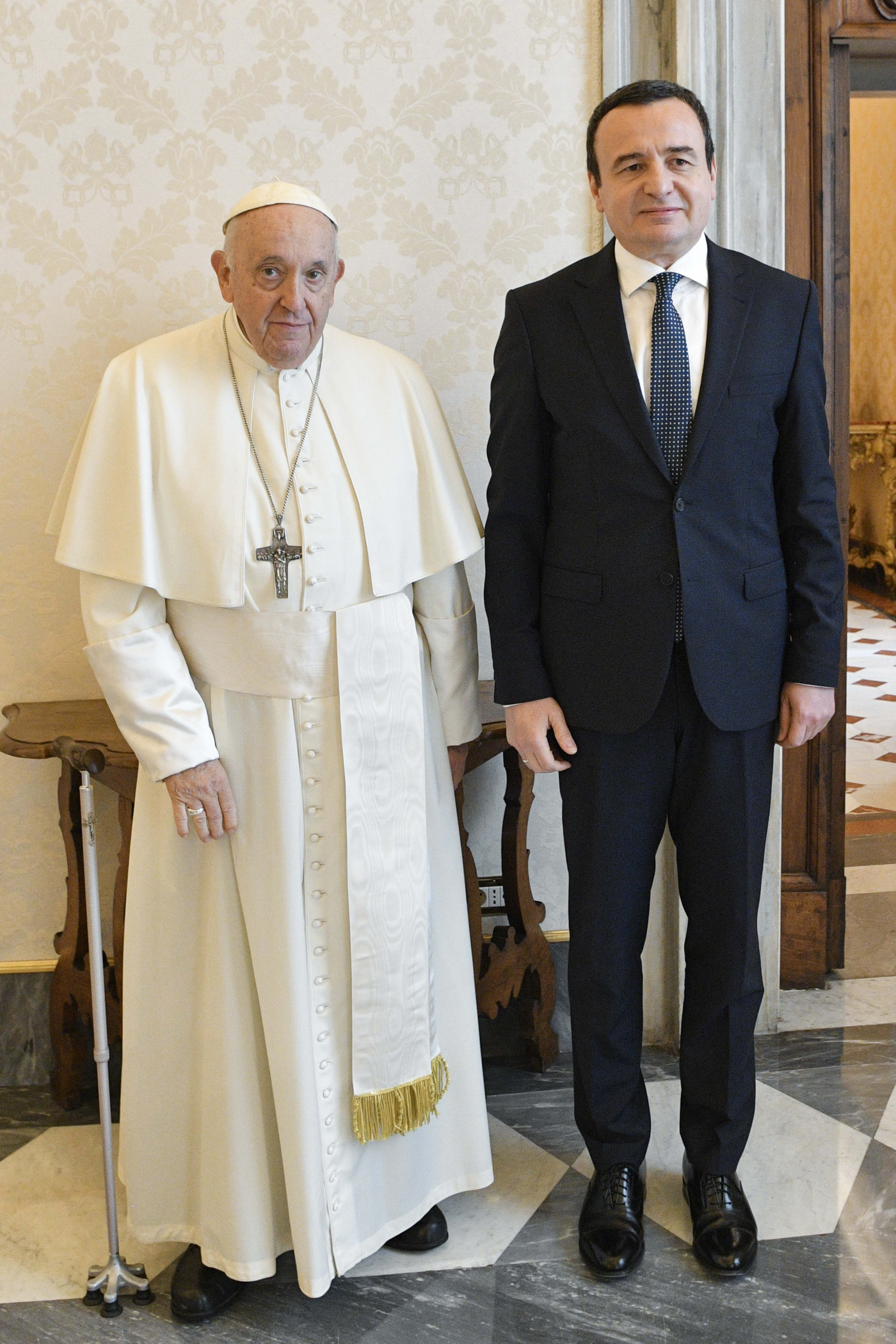 Kryeministri i Republikës së Kosovës, Albin Kurti gjatë vizitës së tij në Vatikan sot, u prit nga Ati i Shenjtë, Shenjtëria e tij, Papa Françesku.