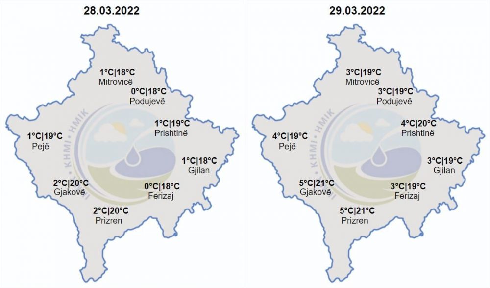 Temperaturat minimale do të lëvizin ndërmjet 0-7 gradë Celsius, ndërsa maksimalet e ditës parashihen të lëvizin ndërmjet 17-21 gradë Celsius. Do të fryjë erë kryesisht nga jugperëndimi dhe më tej në vikend nga veriperëndimi me shpejtësi 1-9m/s./arbresh.info/
