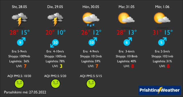 28.05 – Kryesisht me vranësira. Që nga mesdita priten zhvillime të shtrëngatave me shi. Lokalisht priten edhe reshje breshëri. Në mbrëmje vonë reshje lokale shiu.
