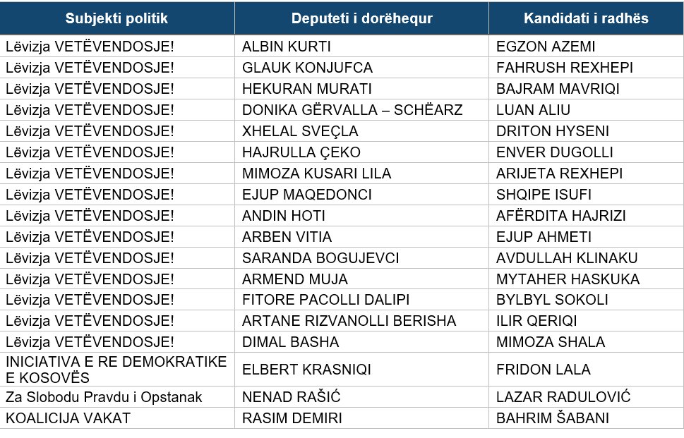 Bazuar në kërkesën e presidentes së Republikës së Kosovës, Vjosa Osmani të dorëzuar më 12 shkurt 2026, për të rekomanduar kandidatët e ligjshëm të radhës, për arsye se kanë dhënë dorëheqje nga pozita e deputetit të Kuvendit të Republikës së Kosovës, Komisioni Qendror i Zgjedhjeve, duke vepruar në pajtim me nenin 112, paragrafin 4 të Ligjit për Zgjedhjet e Përgjithshme, rekomandon 18 kandidatët e radhës, të certifikuar në zgjedhjet e parakohshme për Kuvendin e Republikës së Kosovës, të cilat janë mbajtur më 28 dhjetor 2025, sipas tabelës vijuese: