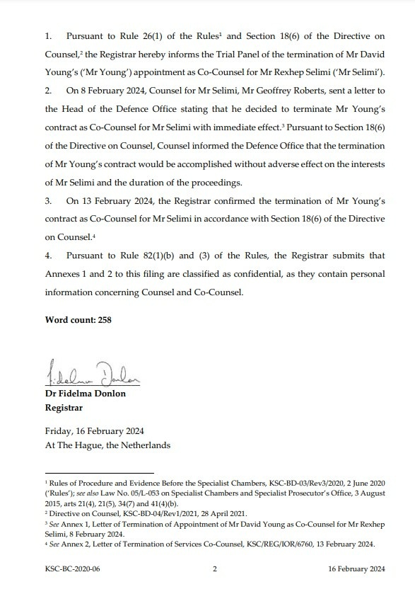 “Më 8 shkurt 2024, avokati i z. Selimi, z. Geoffrey Roberts, i dërgoi një letër shefit të Zyrës së Mbrojtjes duke deklaruar se ai vendosi të ndërpresë punën e z. Young si bashkëpunëtor i z.Selimi me efekt të menjëhershëm”, thuhet në dokument.