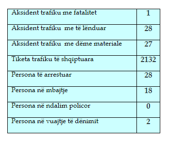 Gjatë kësaj kohe, kanë ndodhur 27 aksidente trafiku me dëme materiale, 28 me të lënduar e një me fatalitet, shkruan Arbresh.info.