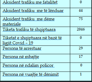 Gjatë kësaj kohe, kanë ndodhur 75 aksidente trafiku me dëme materiale, 44 me të lënduar e asnjë me fatalitet, shkruan Arbresh.info.