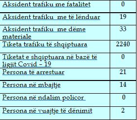 Sipas raportit 24 orësh të Policisë, janë shënuar 33 aksidente trafiku me dëme materiale dhe 19 aksidente me të lënduar.