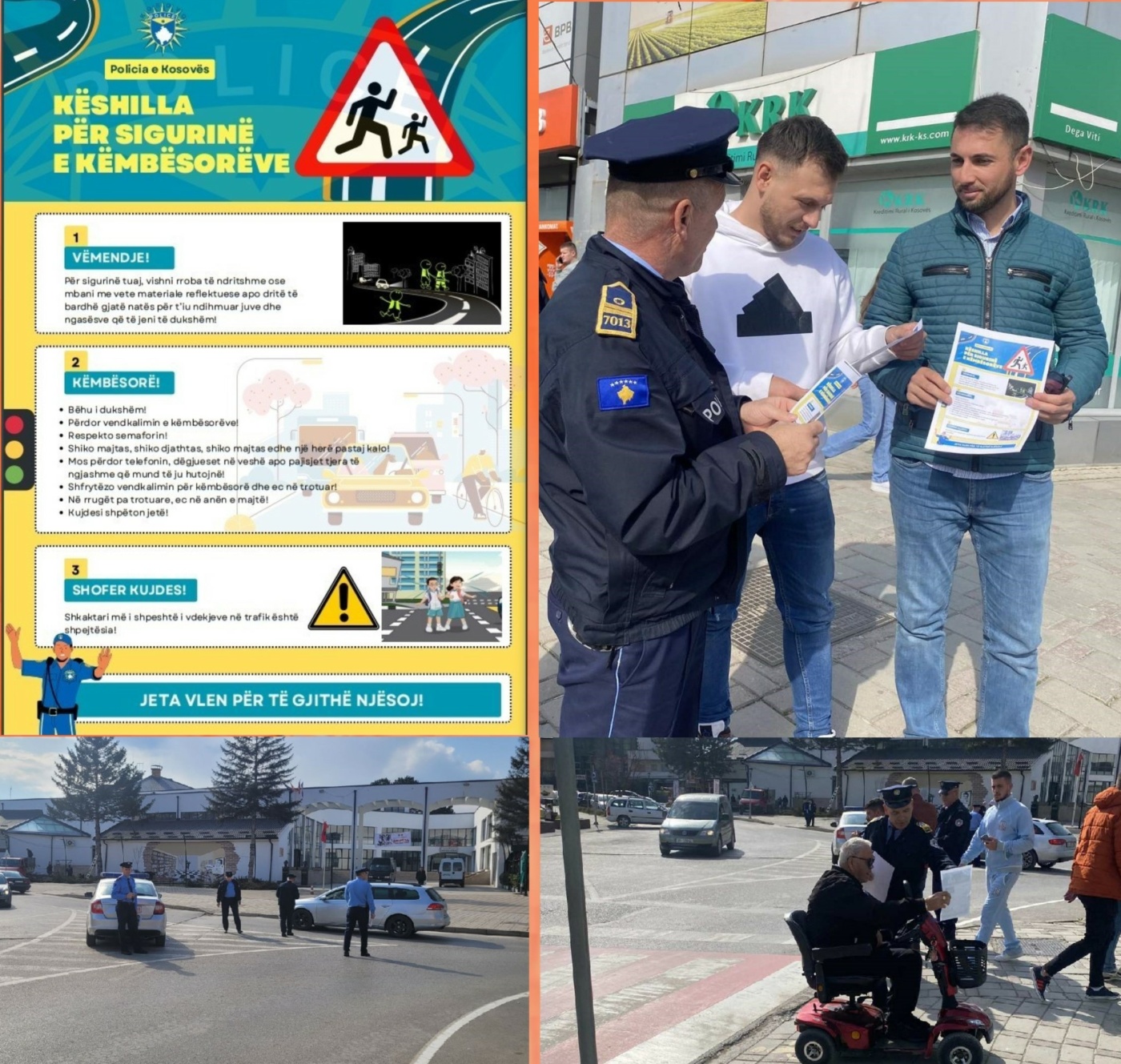 Gjithashtu njësite policore në kuadër të implementimit të planit operativ ‘’Këmbësorët’’ ka vazhduar me shpërndarje të fletëpalosjeve me këshilla të ndryshme për këmbësoret si: të përdorët vendkalimin e dedikuar për këmbësorë, respektim të semaforit, ecjen nëpër trotuare, mos përdorim i telefonit, dëgjueseve në vesh apo pajisjeve të tjera që mundë të hutojnë, në rrugë pa trotuar ec në anën e majtë etj. .