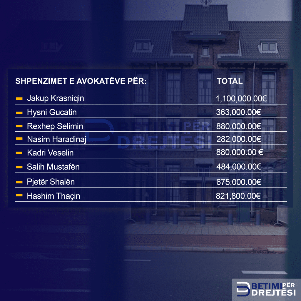 Ndërsa, mbrojtja e ish-presidentit Hashim Thaçi ka shpenzuar 821 mijë e 820 euro, për Pjetër Shalën 675 mijë euro, për Salih Mustafën 484 mijë euro, për Hysni Gucatin 363 mijë euro dhe Nasim Haradinajn 282 mijë euro.