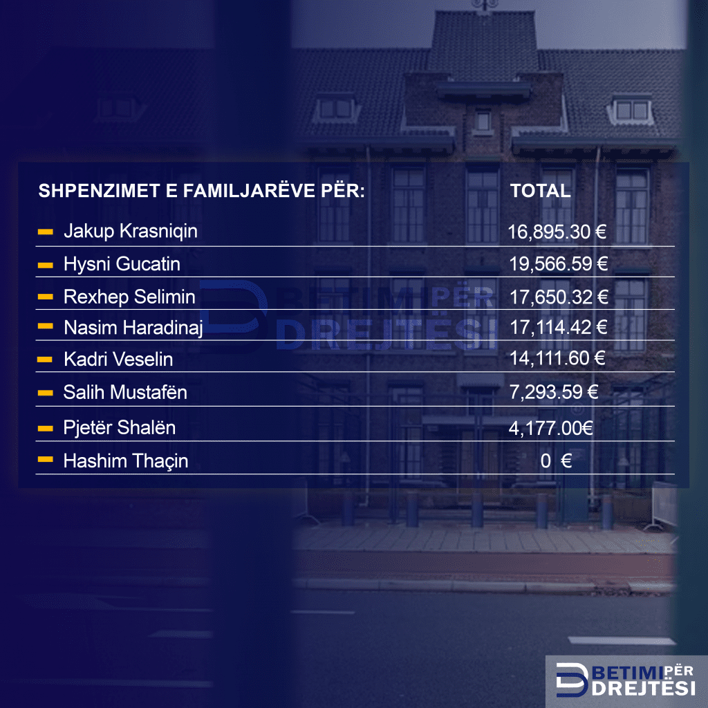 Kurse, për familjarët e Jakup Krasniqit janë shpenzuar 16 mijë e 895 euro e 30 centë, për familjen e Kadri Veselit janë shpenzuar 14 mijë 111 euro e 60 centë, për familjen e Salih Mustafës janë shpenzuar 7 mijë e 293 e 59 centë dhe për familjen e Pjetër Shalës janë shpenzuar 4 mijë e 177 euro.