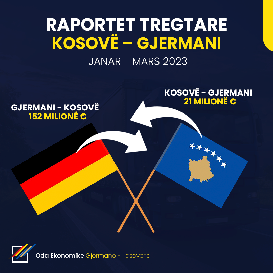 Oda Ekonomike Gjermano-Kosovare ka publikuar të dhënat e përpunuara prej raporteve të Bankës Qendrore të Kosovës dhe Doganës së Kosovës për tremujorin e parë të vitit 2023, në raportin e tregtisë së jashtme me Gjermaninë.