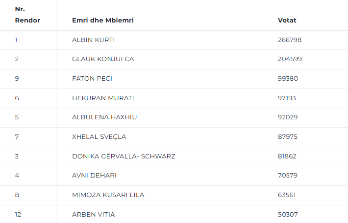 Pjesë e dhjetëshes së fundit janë, Donika Gërvalla me 81 mijë e 862 vota, Avni Dehari me 70 mijë e 579 vota dhe Mimoza Kusari-Lila me 63 mijë e 561 vota./Arbresh.info