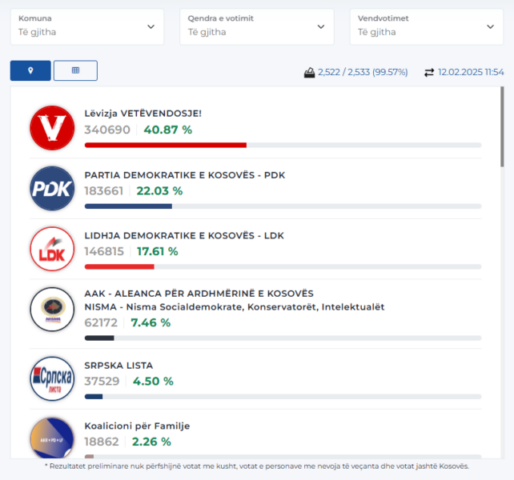 Lëvizja Vetëvendosje ka marrë 340,690 vota apo 40.87%, kur janë procesuar 99.57% e vendvotimeve nga qendrat e numërimit, sipas të dhënave të fundit të përditësuara sot në 11:54.